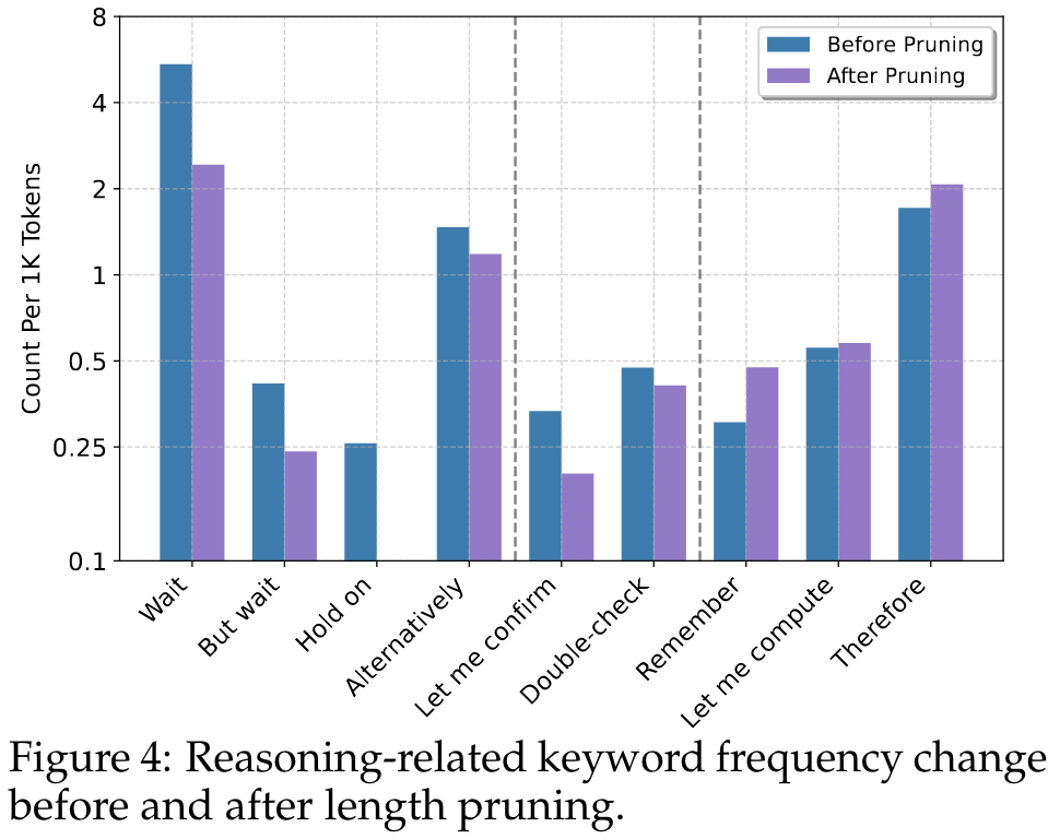 The middle section contains phrases that signal self-verification, which undergo a slight drop in frequency after pruning. This indicates that the model would sometimes skip the self-verification steps, which may sacrifice a little bit of accuracy, to save the token length. Finally, the right section contains phrases that signal core computation and reasoning, which have a slight increase in frequency despite the overall reduction in length. This indicates that the model would maintain the reasoning process, because that is the core process that contributes to the final solution.