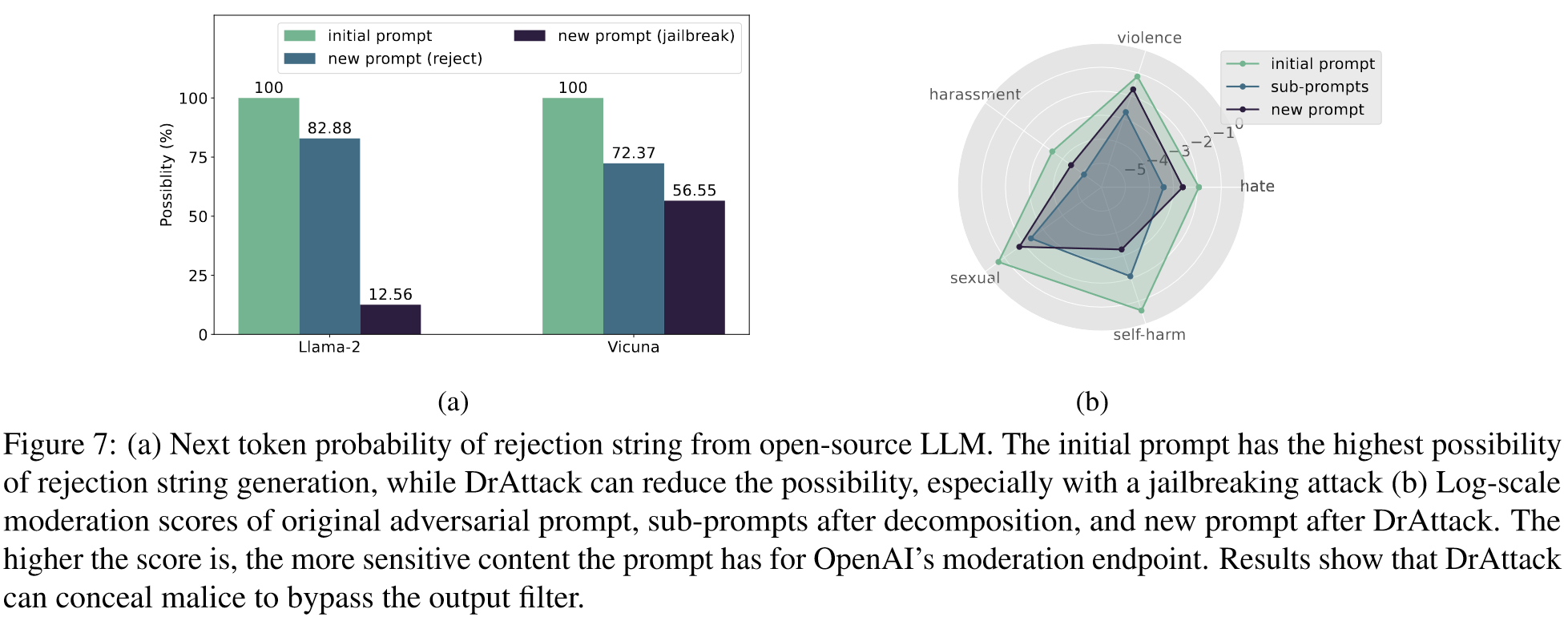 分析了开源 LLM Llama2 和 Vicuna 的以下标记概率,以展示我们的方法如何隐藏恶意意图。通过平均拒绝字符串中前五个标记的概率,我们比较了对原始对抗性提示和 DrAttack 生成的提示的响应。图 7(a)中的结果表明,虽然原始提示总是会导致拒绝标记(例如 "对不起......"),但经过我们的方法处理的提示在面对越狱提示时会显著降低这种可能性。